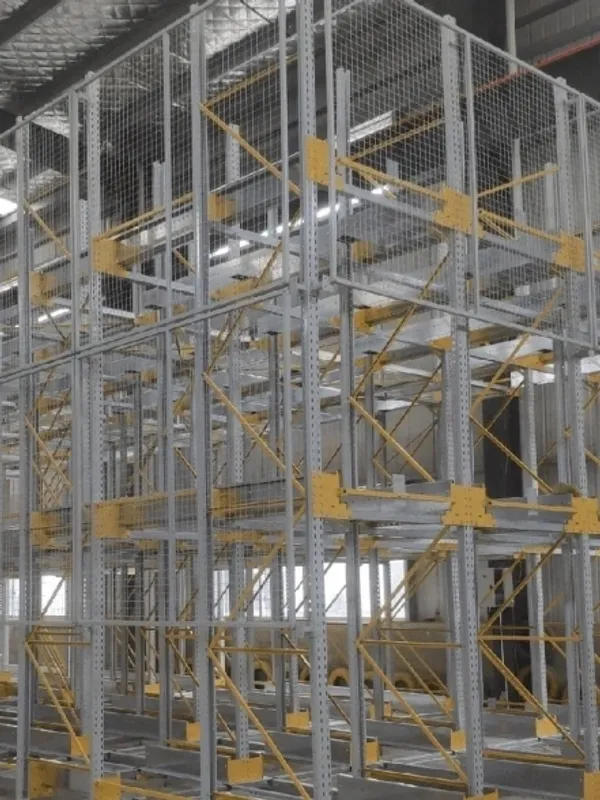 The racking system is equipped with reserved positions for firefighting equipment and safety grates, which ensure operational safety.