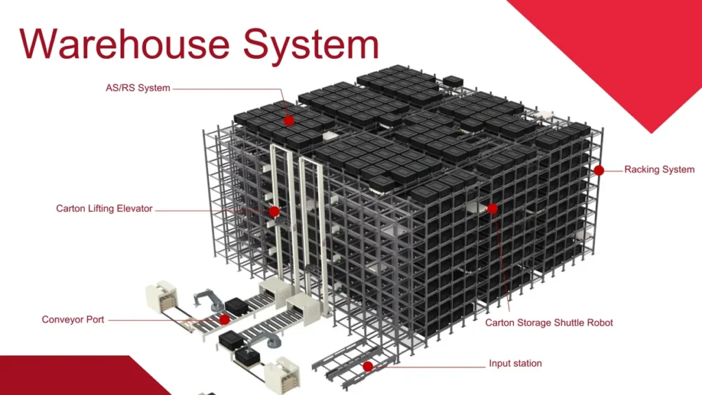 The rack system contains tracks for the smart shuttle robot’s operation.